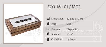 Lareira Portátil, com queimador ECO 01 e base de madeira MDF. Aquece aproximadamente 20 m². Capacidade para 1,5l de Biofluido. Dimensões: 40 x 21 x 10 cm.
