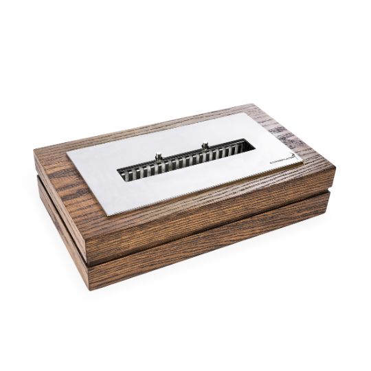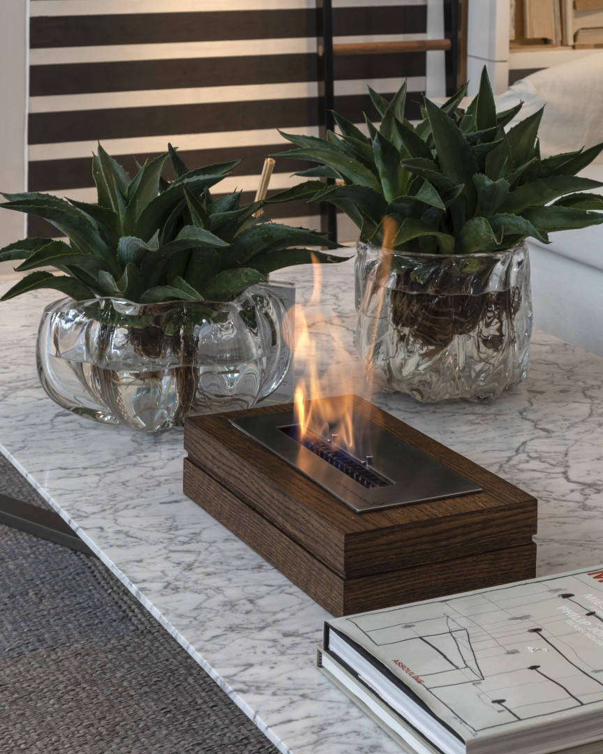 Lareira Portátil, com queimador ECO 02 e base de madeira MDF. Aquece aproximadamente 25 m². Capacidade para 2l de Biofluido. Dimensões: 40 x 23 x 10 cm.