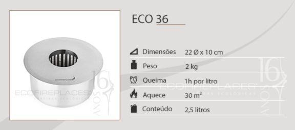 Tempo de queima em média 1 hora por litro, aquece uma área aproximada de 30 m² e pesa 2 kg, com dimensões de Ø 22 x 10 cm.